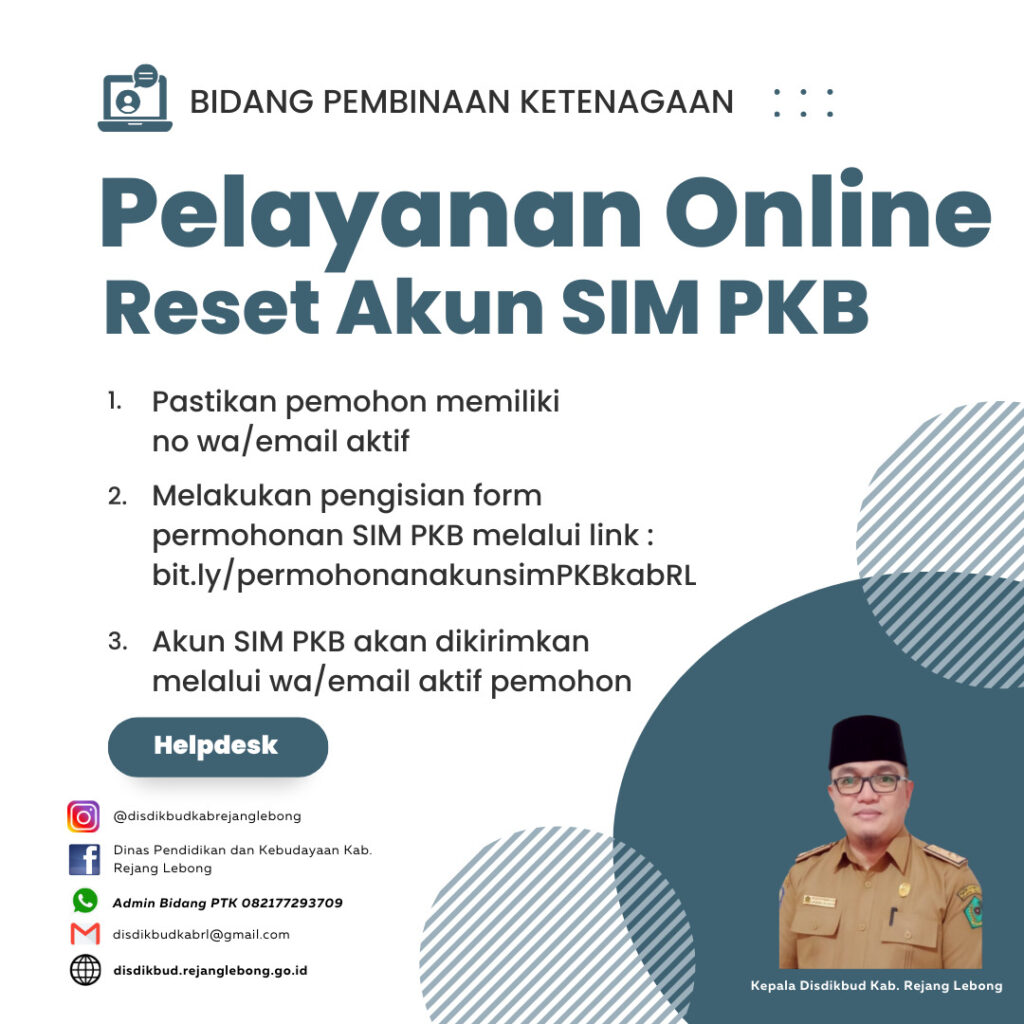 Pelayanan Online Reset Akun SIM PKB adalah langkah inovasi dari Bidang Pembinaan Ketanagaan dalam upaya percepatan pelayanan untuk Sistem Informasi Management Pengembangan Kepropesian Berkelanjutan (RESET AKUN SIM PKB).